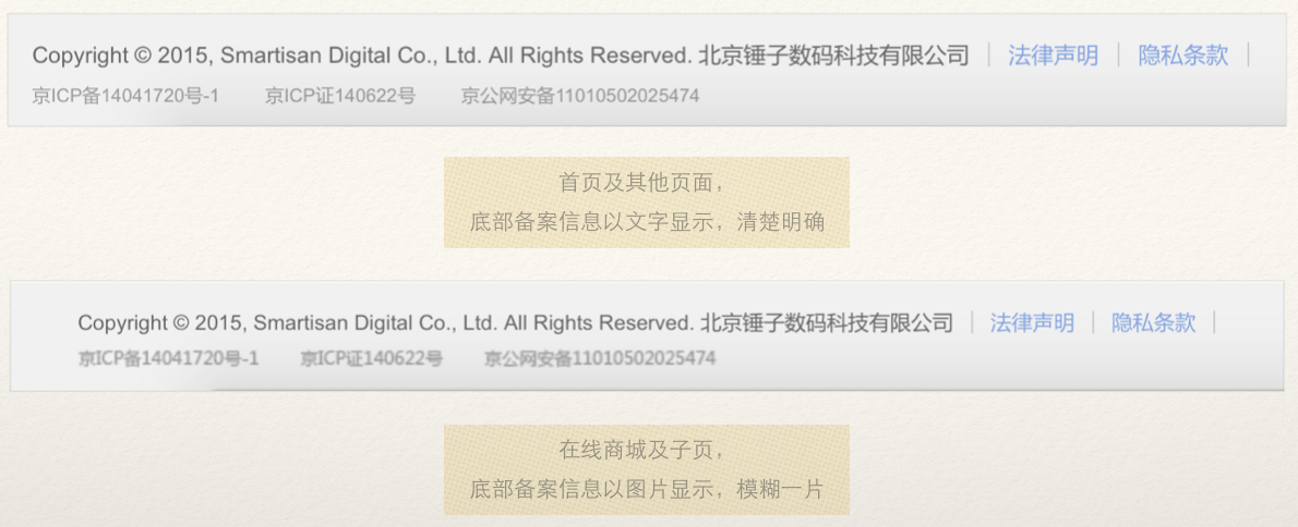 锤子科技的官方在底部样式彻底一样的情况下,却使用了分开维护的多份代码。这样的做法常常会导致 bug 死灰复燃,就如图中那样,曾更新修改了备案信息为文本,网站上却仍旧因为没有调用公用代码来再出现老的样式。