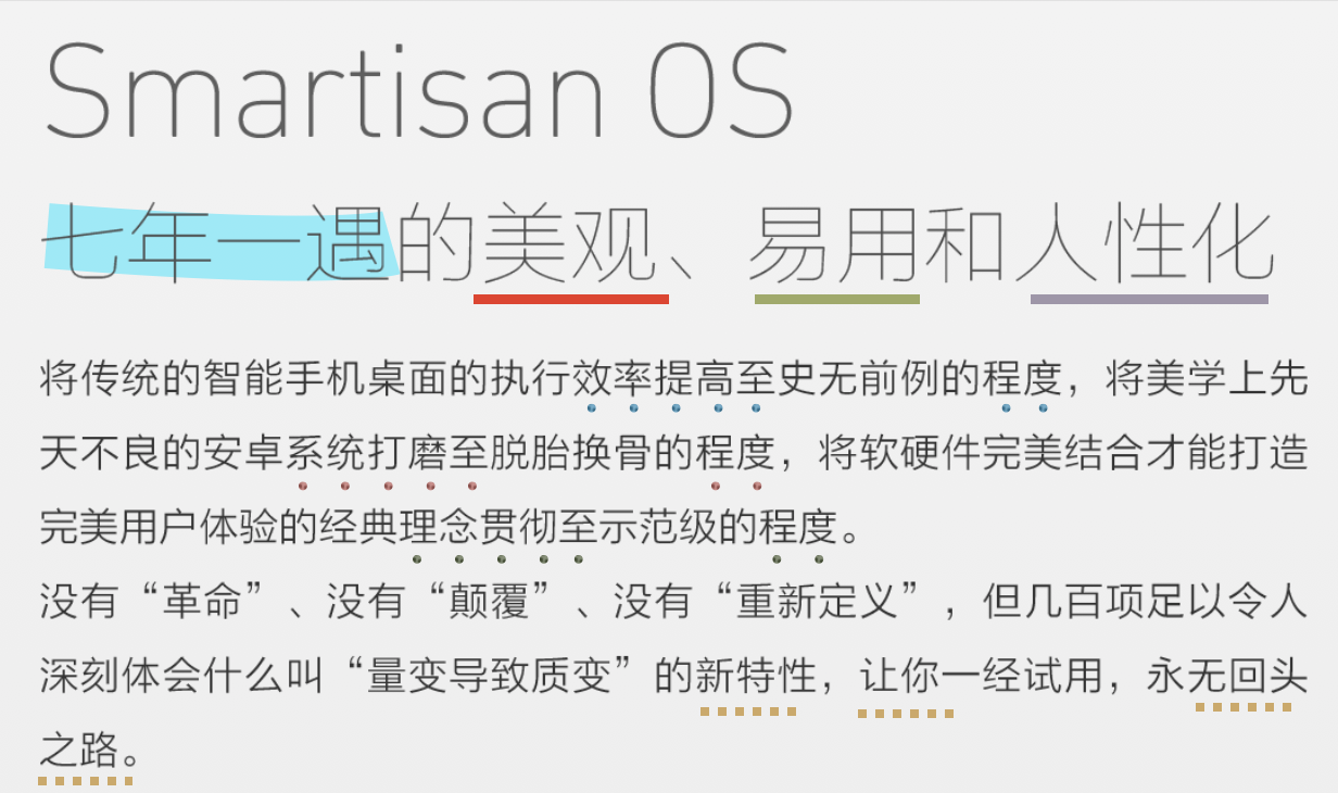 图中小标题(论点)看起来是要论述「OS 美观、易用和人性化」。正文(论据)句子主干却是:「提高至程度」、「打磨至程度」和「贯彻至程度」,超长定语组合而成的三个排比句,没有明确主语,读得人云里雾里,也跟「美观」、「易用」和「人性化」没什么对应关系。