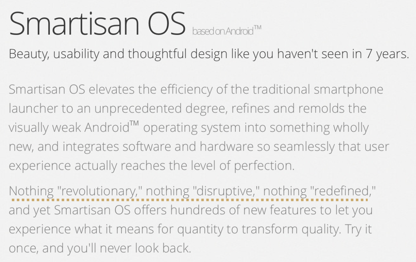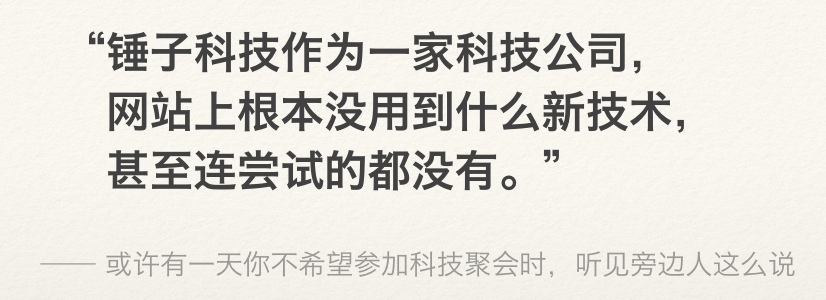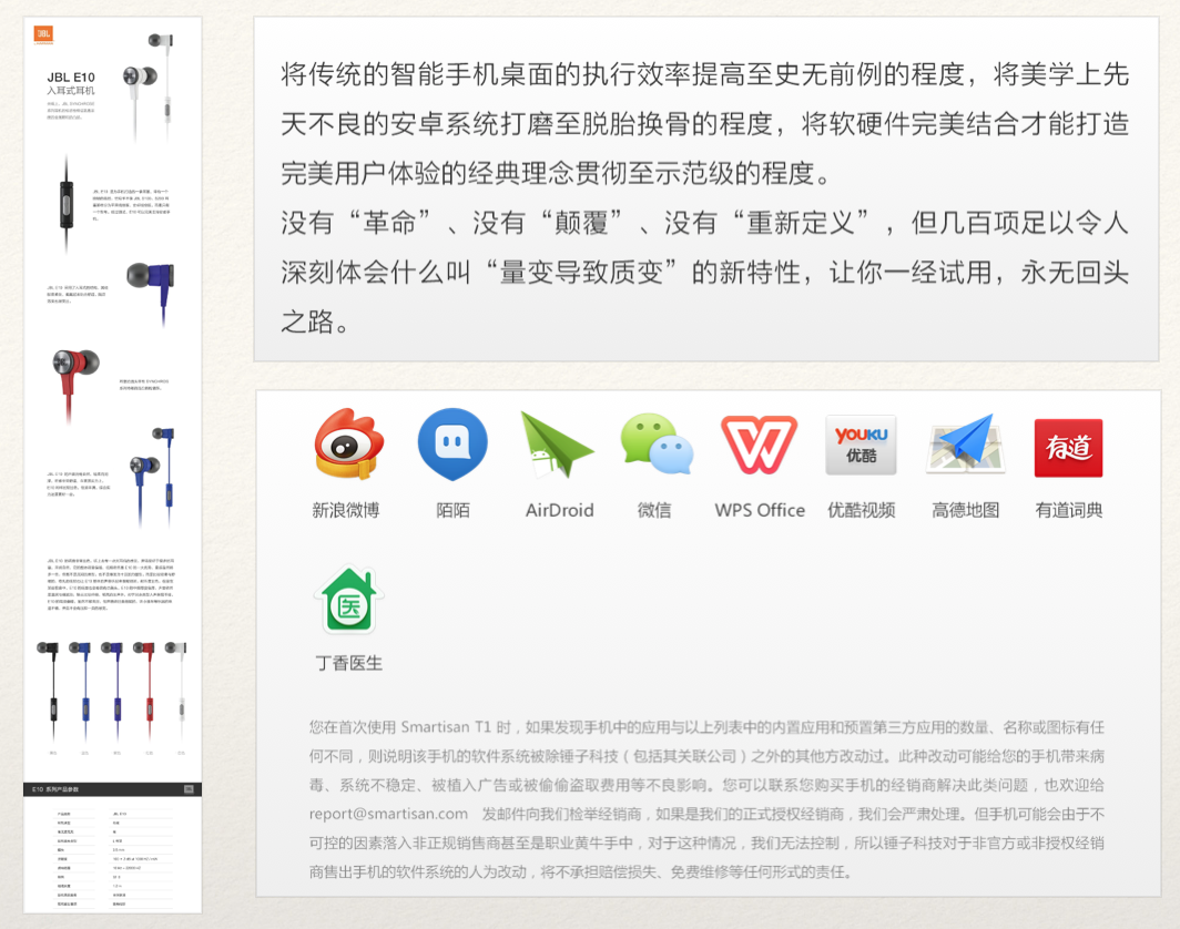网站的每一屏就应该是一个能够说服人的「幻灯片」,每个小标题是一个论点的话,那下面论述它的文字就应该是论据,而锤子官网的文字却可谓是乱写一通。