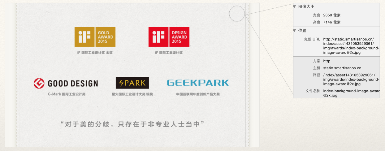 因为靠切片贴图的方式来实现,IF 获奖的荣誉页面既然没有任何一个字可以供用户或者科技 复制。同时这个页面从头到尾从上到下没有一个「分享」按钮。难道锤子希望的,用户需要的不就是一个「传播」的功能吗?既然就这样 miss 掉了。