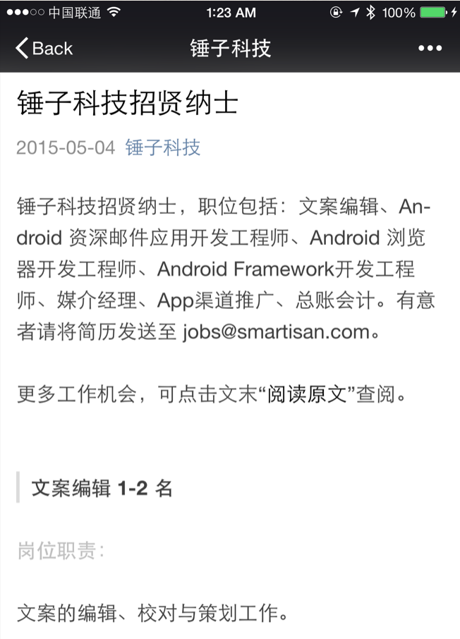 图 1 的锤子科技公众账号于 5 月 4 日发布了招贤纳士的通告,招聘了文案编辑等新近人才。图 2 官方网站的最后更新时间是 3 月20 日,找不到公号罗列的职位。